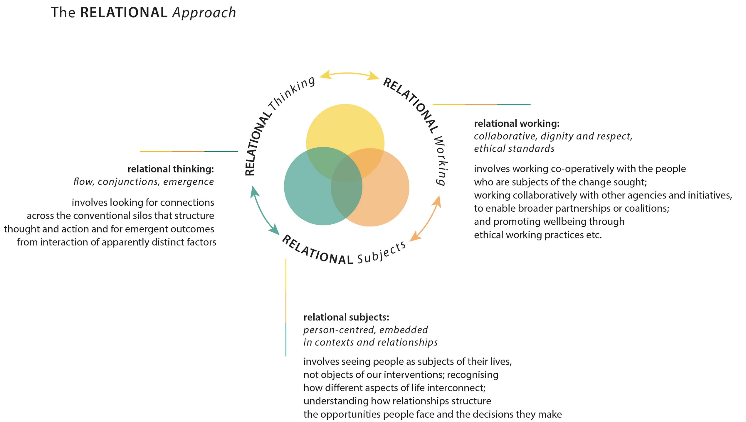 The relational approach is at the core of RWB. This too has three aspects — relational thinking, relational working, and the idea of people as relational subjects embedded in relationships with others and their contexts.