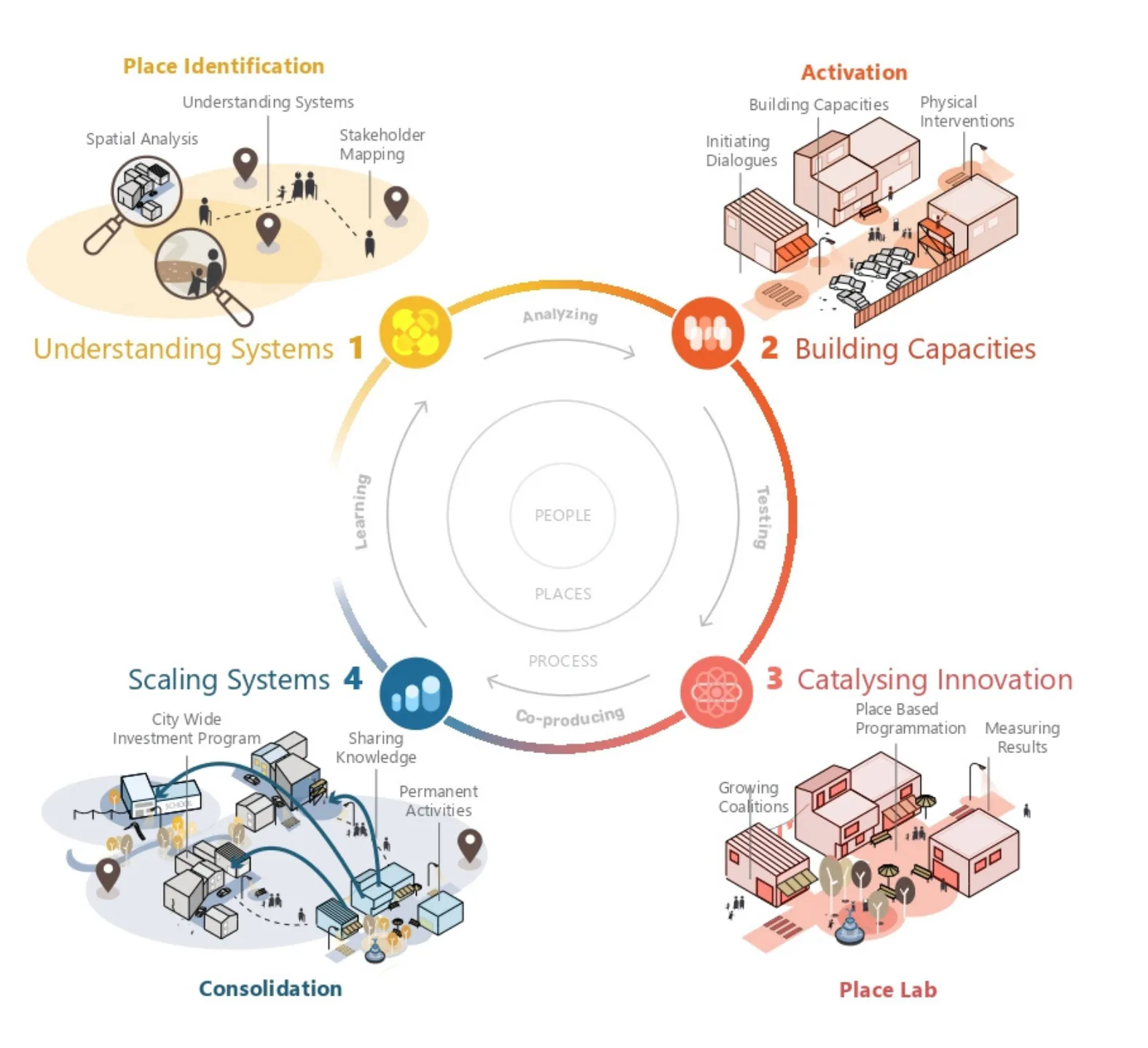 Placemaking starts with the identification of typologies of unsafe spaces and stakeholders that can do something about it. In a second step the activation of spaces through dialogues and physical interventions allows to build capacities amongst young people and their communities to prepare for structural change. Well-chosen interventions on strategic spots in the neighbourhood can then be leveraged as place labs or innovation hubs, where coalitions grow in an innovative and inspiring way. These experiences will allow young people and local authorities allow to measure results and consolidate a city-wide investment in safety for young people.