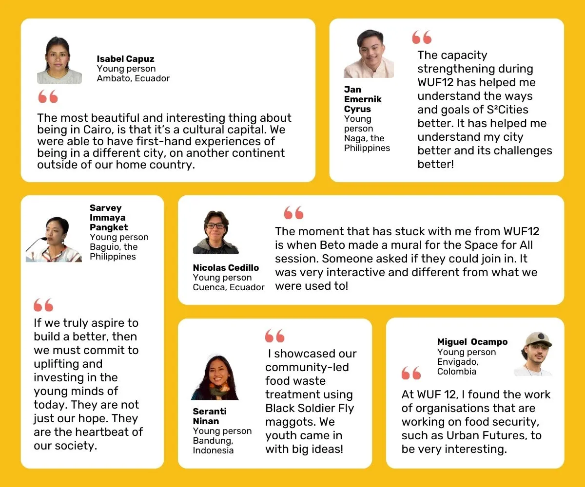 S²Cities young people and partners took center stage at seven formal sessions during WUF12, sharing the platform with academics, government representatives, urban planners, and other advocates. They addressed a wide range of critical issues, including public spaces, mental health, environmental preservation, food waste, and water systems, emphasizing how these challenges can be effectively tackled through active youth participation and leadership.